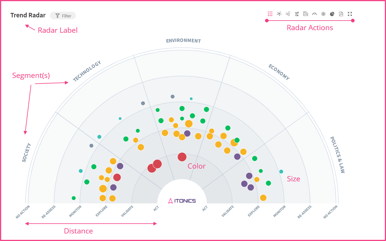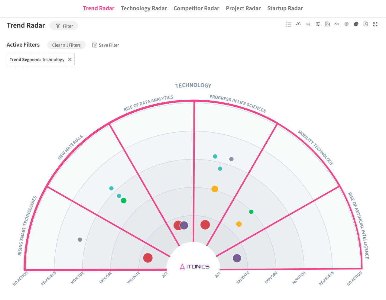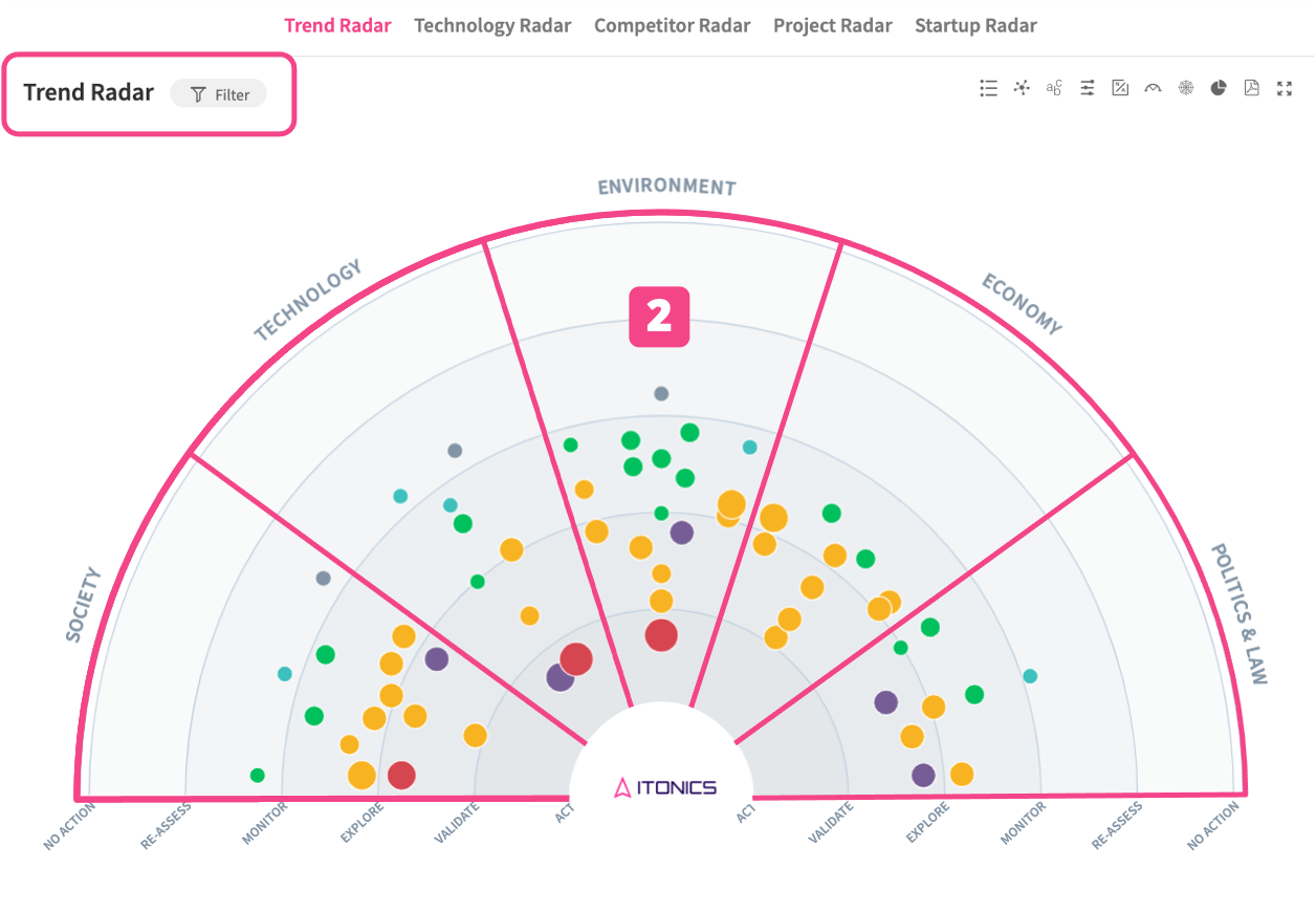 The ITONICS Radar is the module for displaying a rich content landscape and understanding it easily by representing multiple characteristics simultaneously by the distance to the radar center, placement in a segment, color, size, and shape.