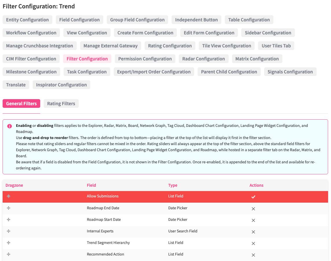 NUC-16329 - Enhanced the flexibility of filter handling by extending the filter configuration by a drag and drop option to easily define the order of the filter section, emphasizing more relevant filters.