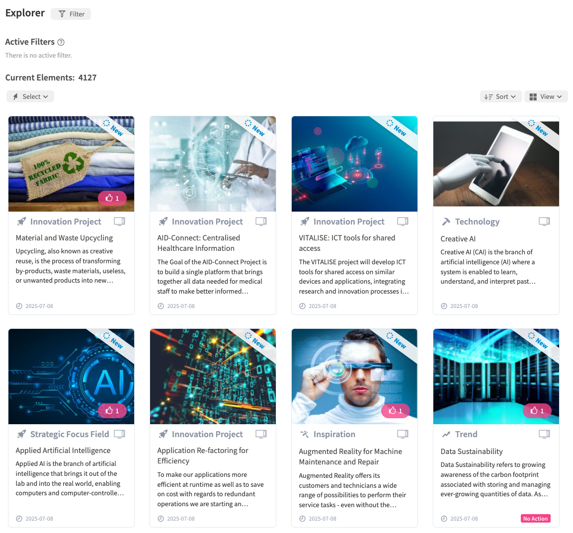 NUC-16222 - Introduced a more modern design of the Explorer , especially of the element cards (and applied across the entire ITONICS Innovation OS)—all while keeping existing functionality unchanged.