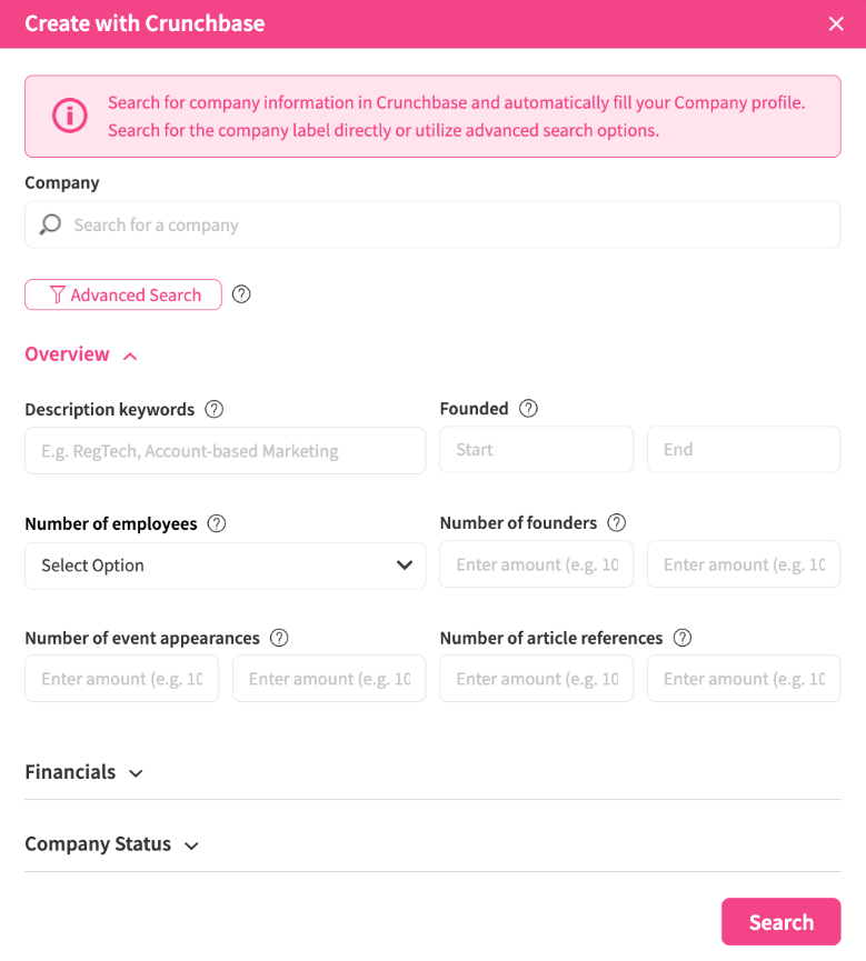 NUC-15472 - Enhanced the Crunchbase integration by enabling creation with a more advanced and topical search approach, using additional filter parameters to refine the search via Crunchbase.