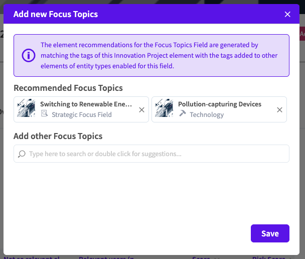 NUC-16704 - Enhanced the capabilities of the Element Search Field (ESF) by introducing recommended content relations for this field type. This feature provides users with tag-based element suggestions, ensuring more consistent and efficient linkage of data across the ITONICS Innovation OS.