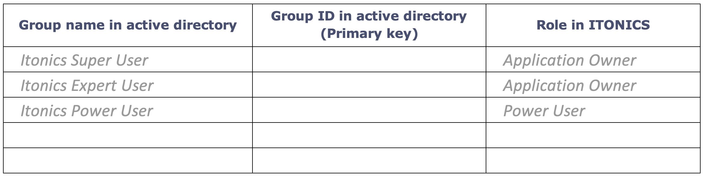 Should it be required that users be automatically assigned roles in the ITONICS platform when they first log into the system, the developers at ITONICS will need to map the various group names as set in the federated server active directory to the matching role names in the ITONICS platform.