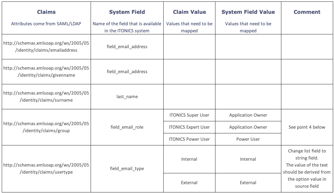 - System Field: System fields are the fields that have been configured under Manage Field: User Configuration in the ITONICS application, /user_configuration/1/types/manage/fields. These are the destination fields to which the fields from Claims will be mapped.