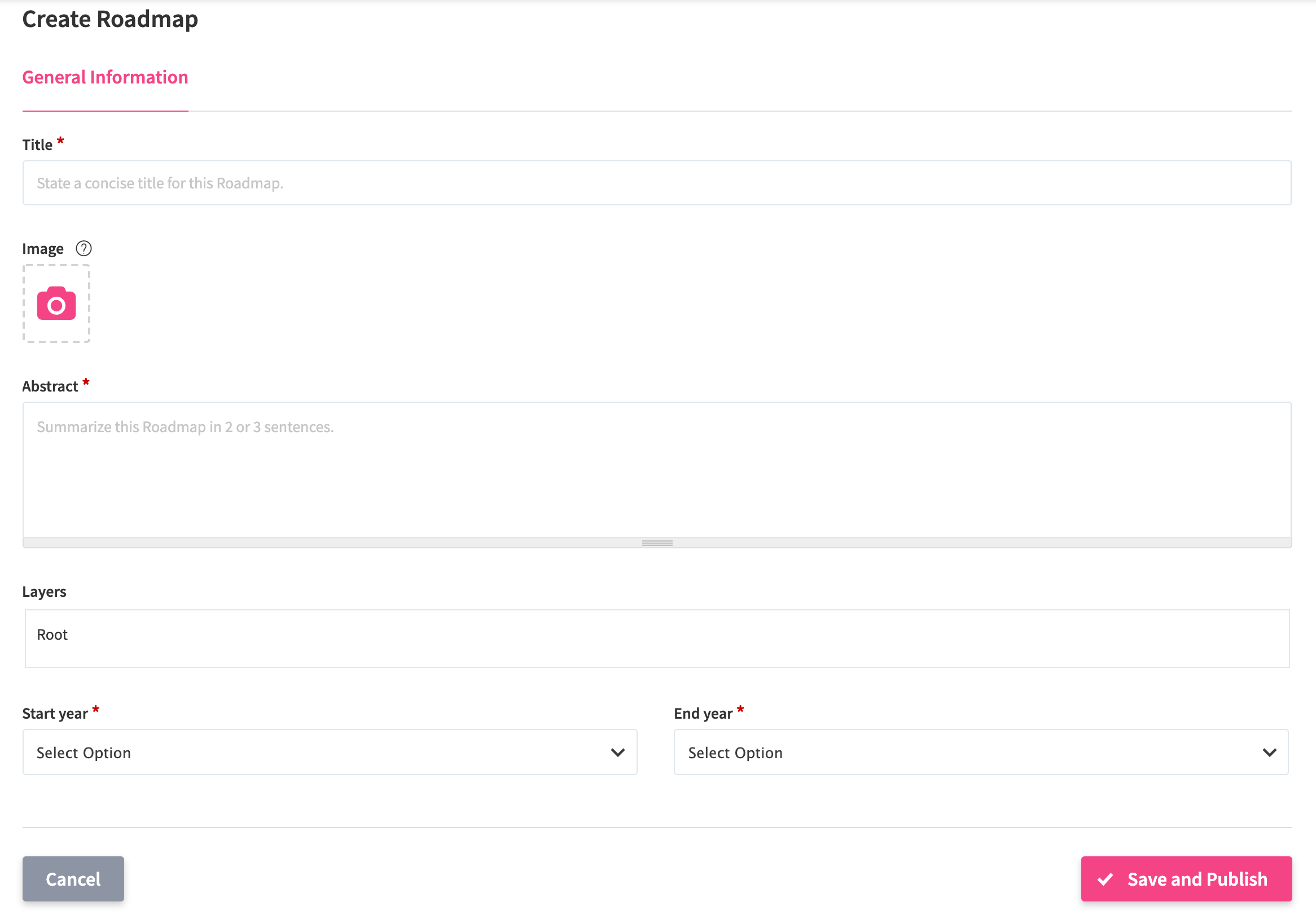 A title, abstract, start, and end years are required information to enter. You can add an image and layers if you want to (optional).