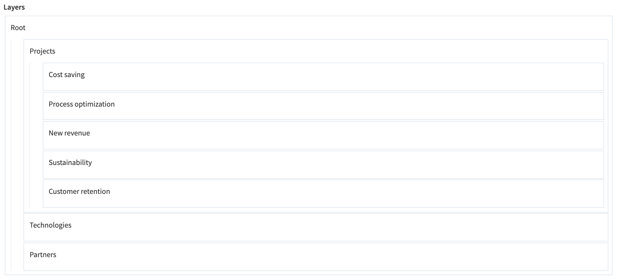 The layer structure is in general not related to the entities, i.e., every entity can be put into any layer. However, it makes sense to separate this already on the entity level. This means that it might make sense to create three different entities: drivers or objectives, products or assets, and technologies or building blocks.