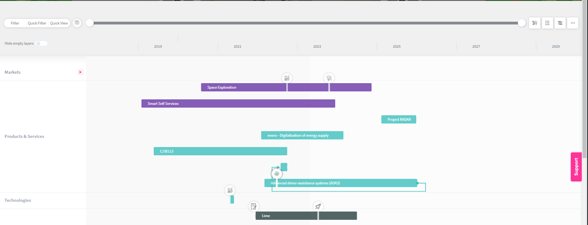 Following the above steps, you can define and set up your layer structure for your roadmap in no time. The below shows a best practice example connecting (innovation) projects with technologies and partners.