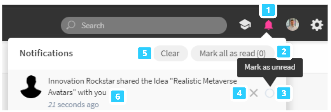 • To mark a single notification as read, click the circle icon next to it while hovering. (3)