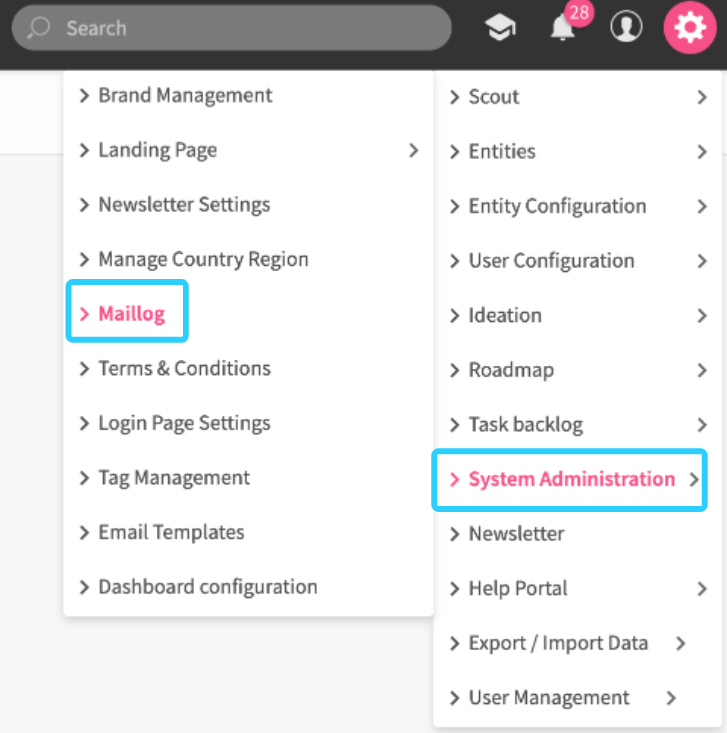 To get an overview and history of all system emails sent, navigate to the Settings Wheel > Logs > Mail Logs.