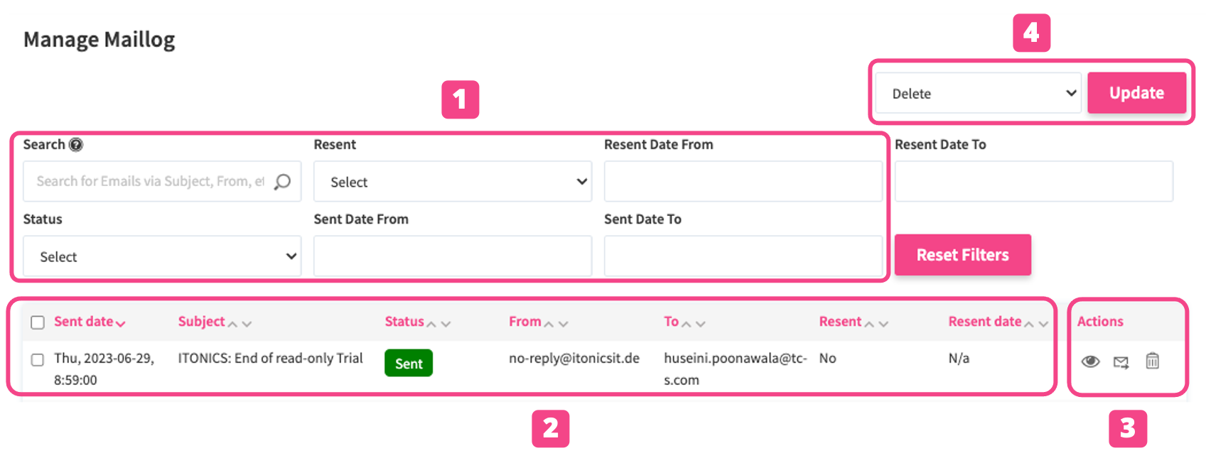 The mail log table provides an overview of (2) the Sent date, the Subject of the mail, the Status, information about sender and receiver, and whether the mail has already been resent. Besides, the mails can be managed via action buttons (3):