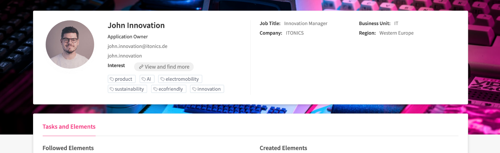 This user profile page helps other users to learn more about you, know how to get in contact, and what your interests are. Typically, it contains personal information about the user such as username, e-mail address, role, job title, and the user profile picture, as well as content elements that were created, followed, or shared with the user. However, it can be adjusted by the Application Owner.