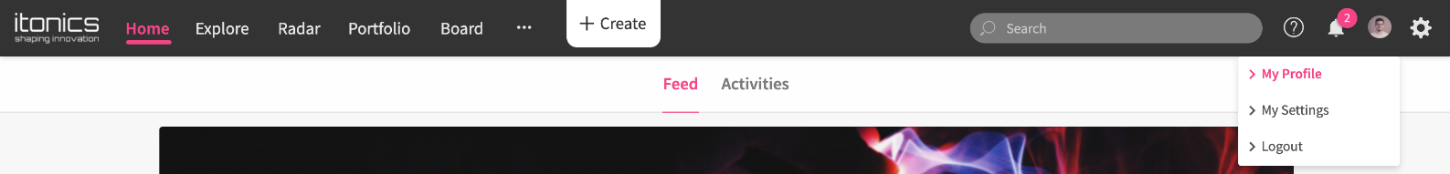 To update your user account information, look into the top right corner of the application and hover over the profile picture icon. By clicking on my profile, you can view your profile and how it appears to others.