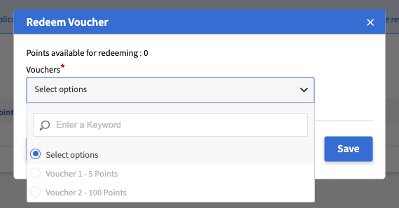 Clicking on Redeem will again open a popup modal, where the user can select from a dropdown menu from the vouchers available for selection / configured. Note that only vouchers for which the user has gathered the required threshold value of points will be available for selection.