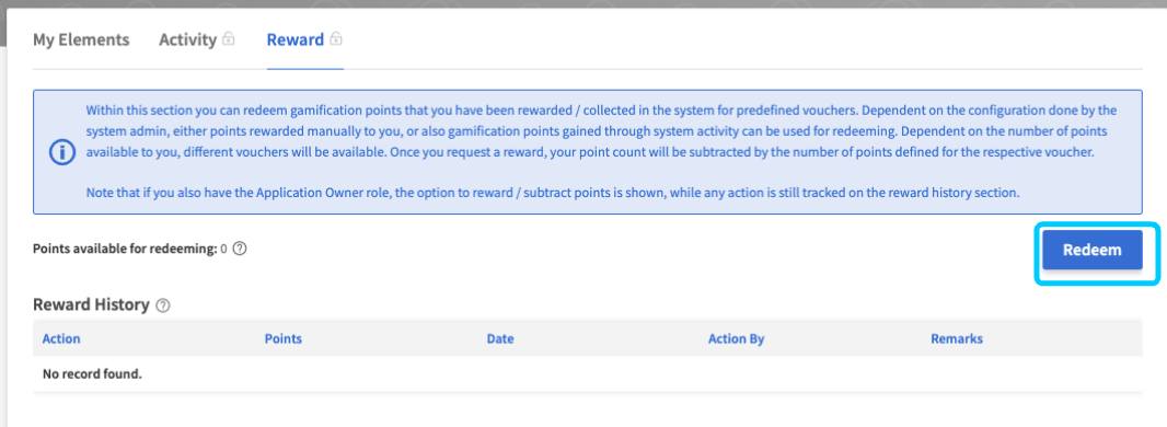 To redeem a voucher for collected gamification points, a user needs to navigate to her/his own user profile, where also the Reward tab and Reward History table will be shown. However, in the case of the regular user, instead of the Reward button a Redeem button will be shown.
