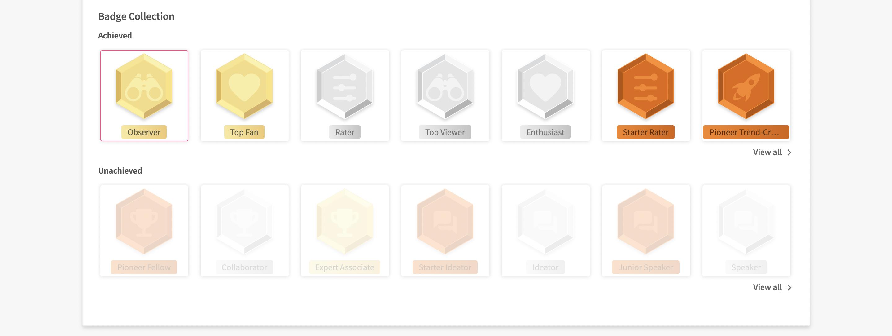 You can activate any achieved badge by clicking on it. The active badge will be shown on the user profile personal data section under the user's profile image and on the profile widget when hovering over the user's name or image.