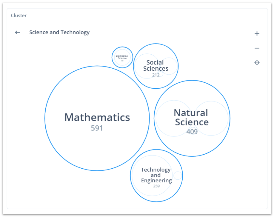 The cluster visualization allows you to discover the contents of your search field by topics. We currently use the category property to cluster the documents. These are based on the IPTC Media Topics standard.