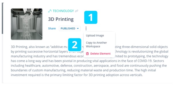 Navigate to the Detail page of an Element, click on the three dots next to the Element's status (1) and select Copy to Another Workspace (2).