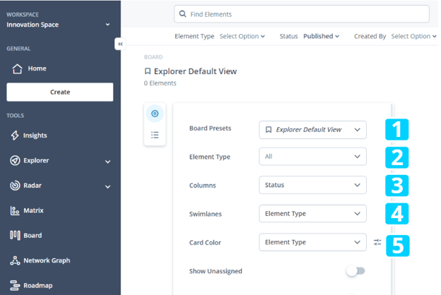 - Swimlanes: The Board is grouped by Element Type. (4)
