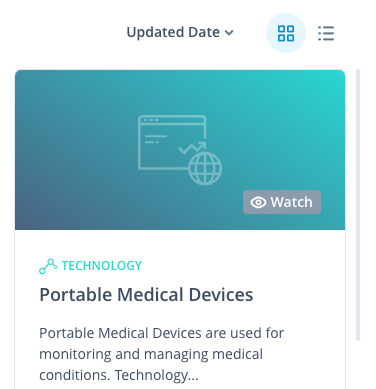 You can arrange trends, technologies and other elements via cards or list view.