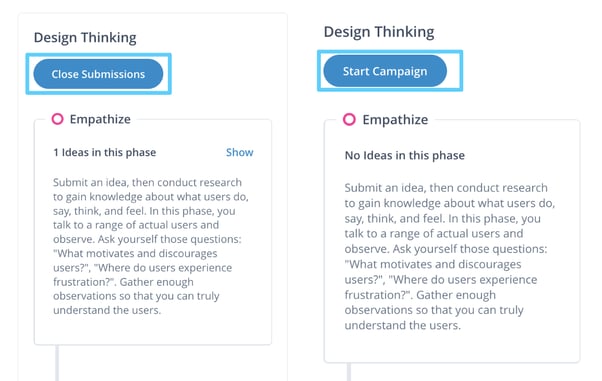 Once you have clicked the Close Submissions button, users cannot submit new ideas until you click the Start Campaign button, which will reopen the campaign and allow users to submit ideas again.