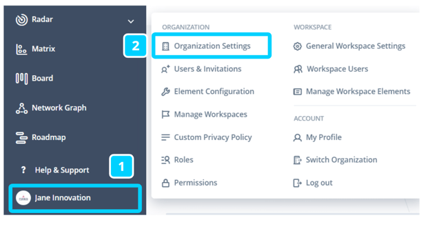 Click on the username on the left bottom corner (1), and then go to the Organization Settings (2).