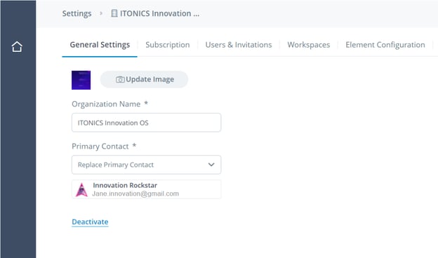 You can update the image, organization name and primary contact via General settings.
