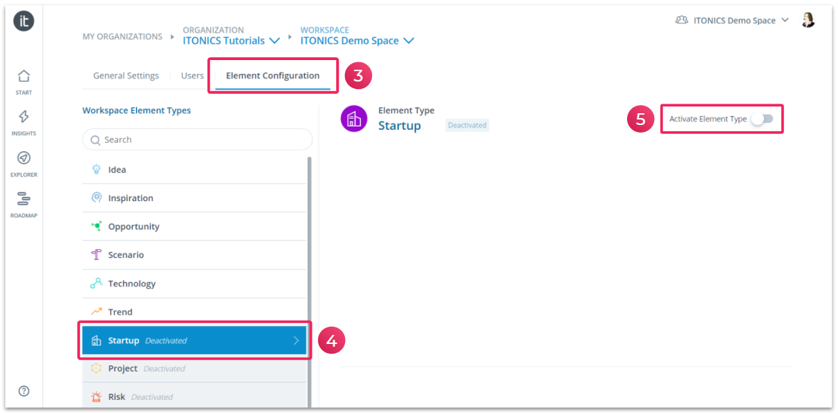 4. Choose the Element Type to add to the Workspace and flip the toggle.