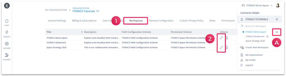 To get to the Workspace settings, either use the gear-icon in the Workspaces picker (see A above) or...