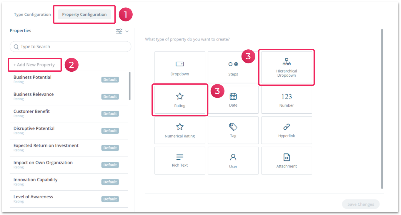 - Choose one of the different types of Properties we provide. In the example we are adding a Property for a custom segmentation ("Hierarchical Dropdown", but a regular "Dropdown" would also work) for the Radar, and a custom Rating criterion.
