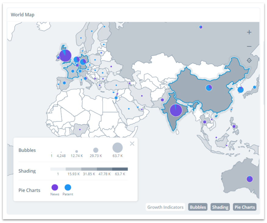 Want to find out where the Signals of your search field are concentrated? Where they are growing the most? Then use the world map visualization, which uses the country of publication to group the Signals.